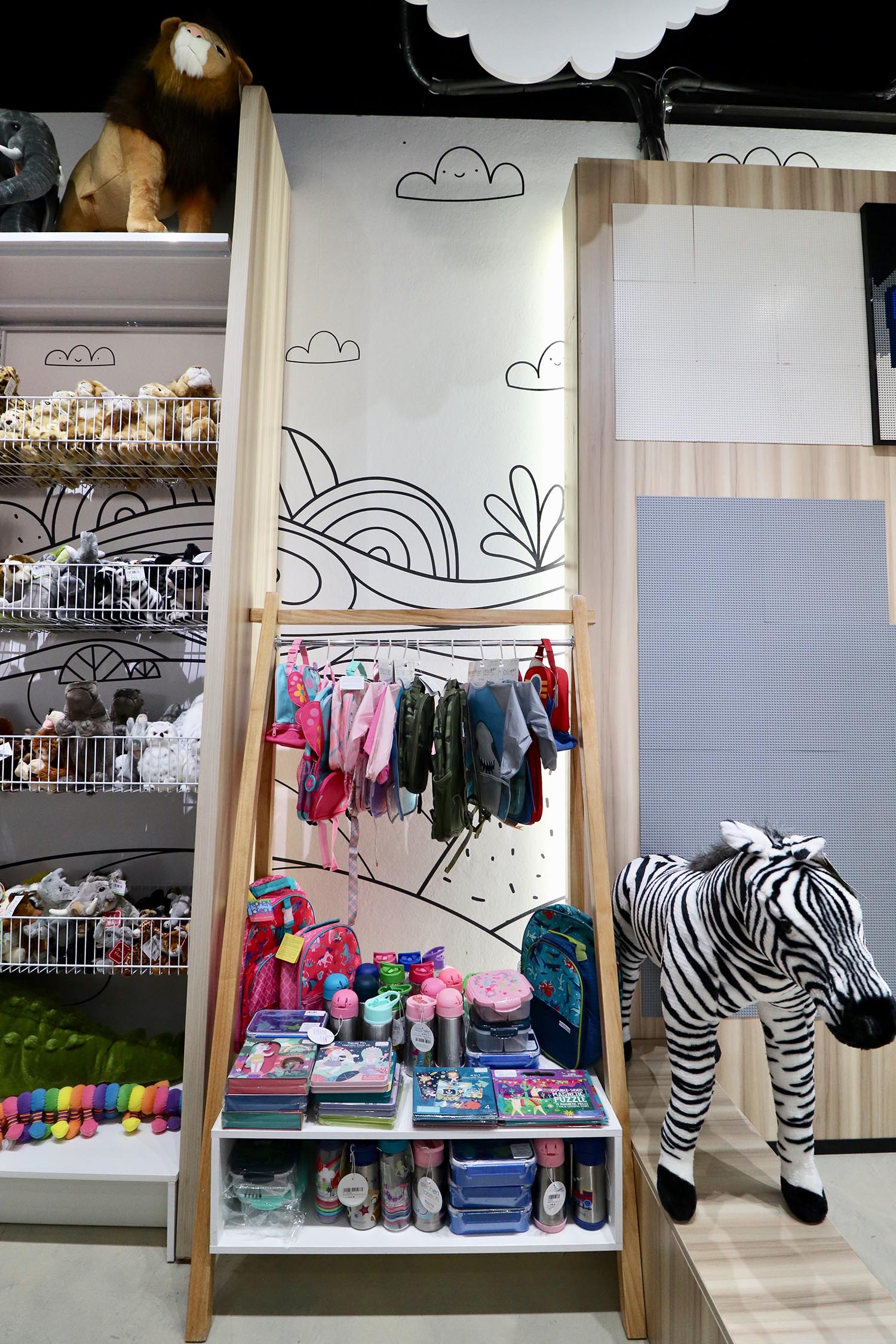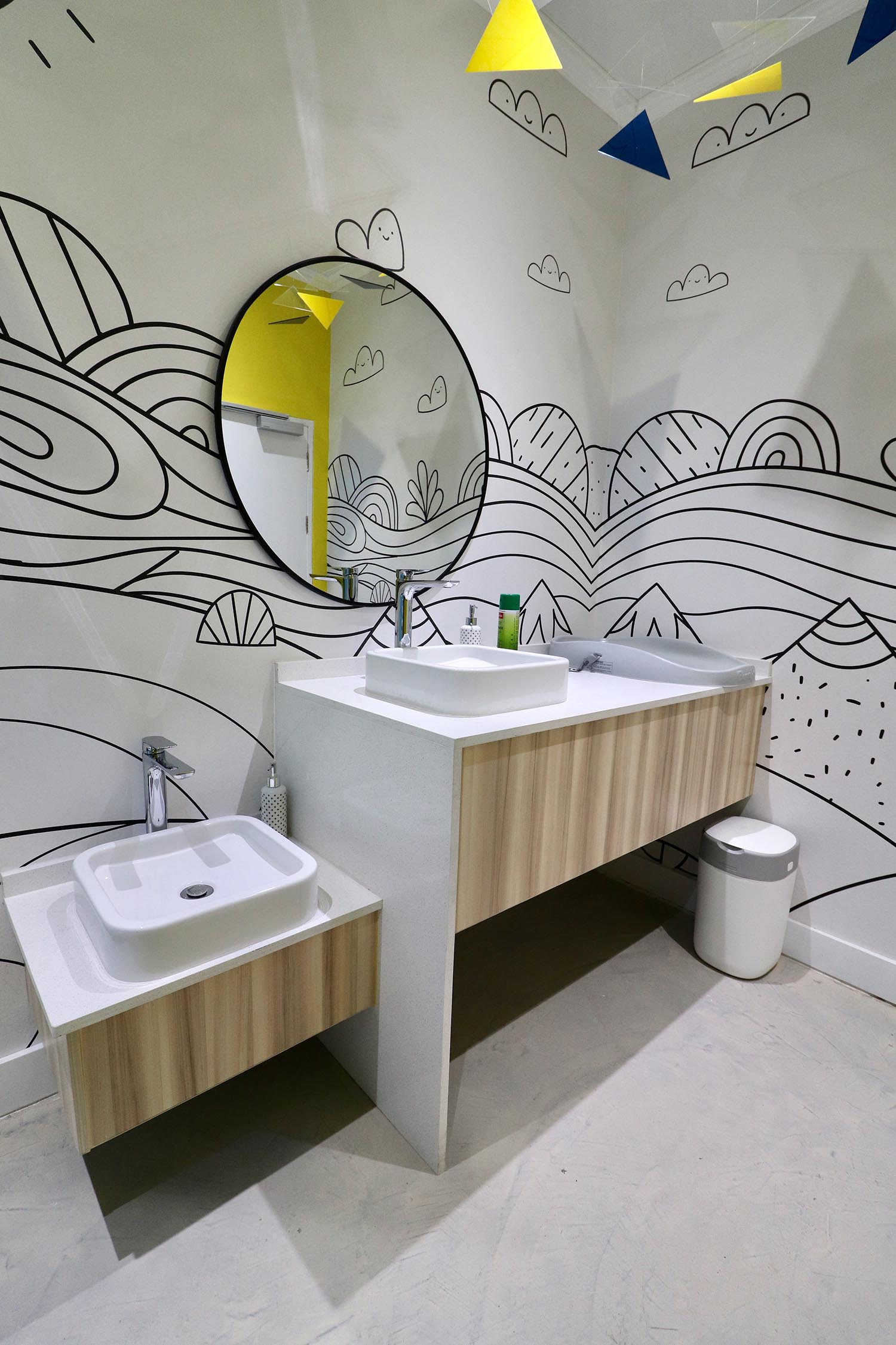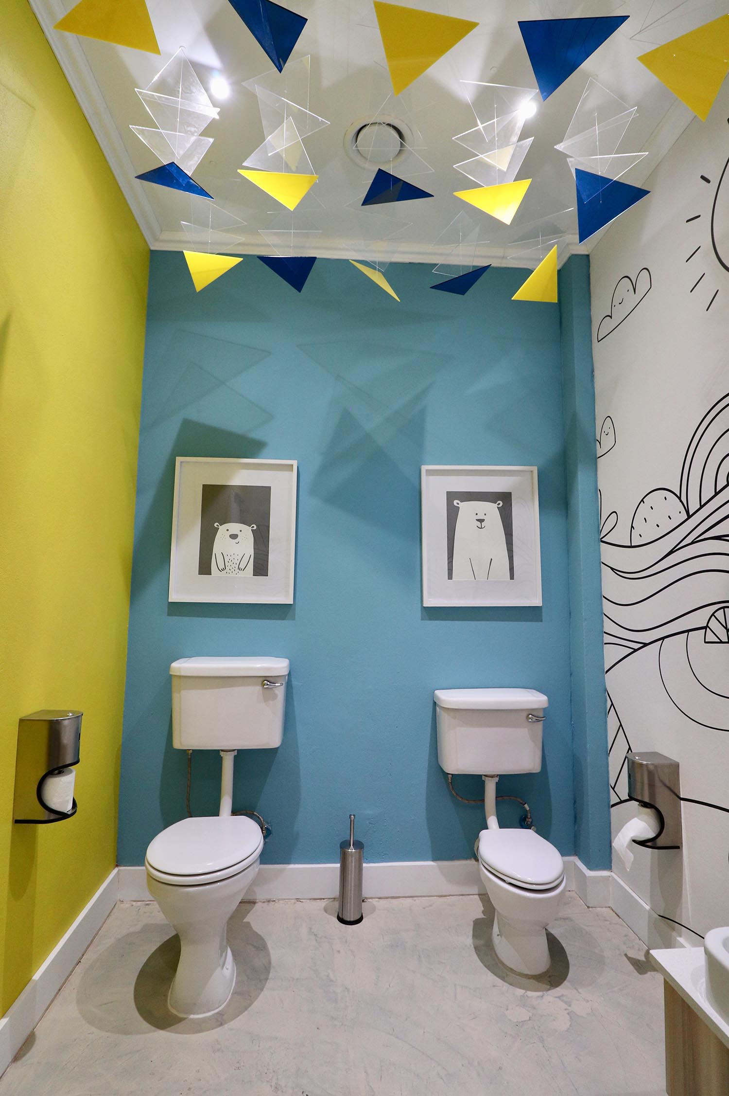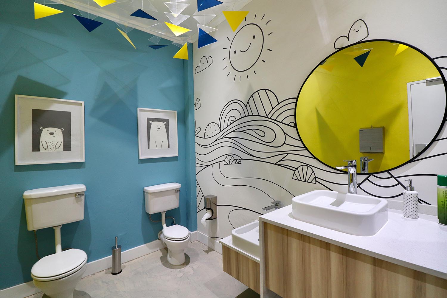 Another draw card for the store is the fun family bathroom, complete with a kid size toilet and basin. Blue and yellow Perspex mobiles dance on the ceiling, with fun line drawing wallpaper decorating the walls. A mommy bear and baby bear picture hangs above each toilet adding a quirky element. The bathroom also has a changing matt and ample space to fit a pram making it every mom’s dream changing room while out and about.