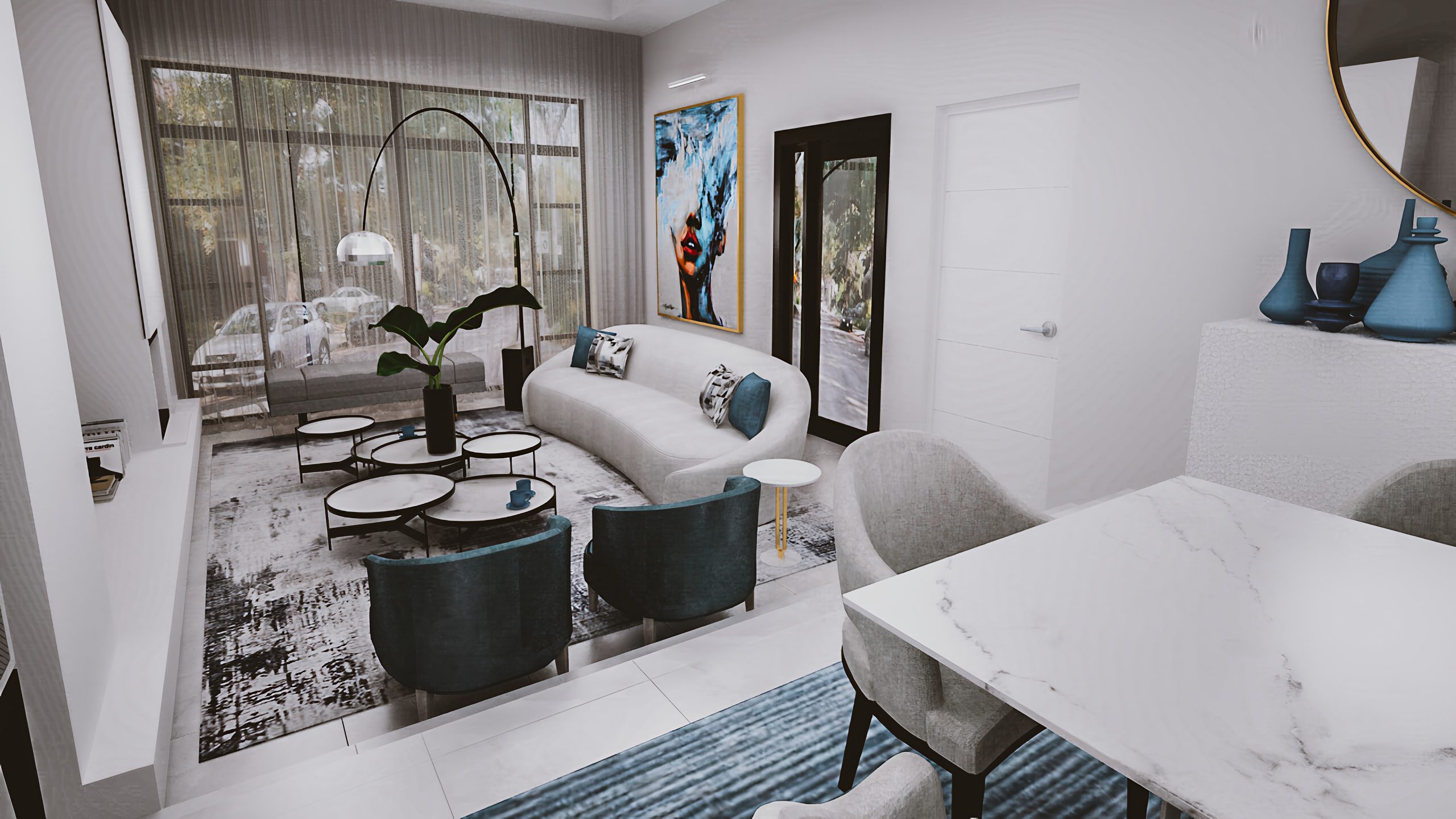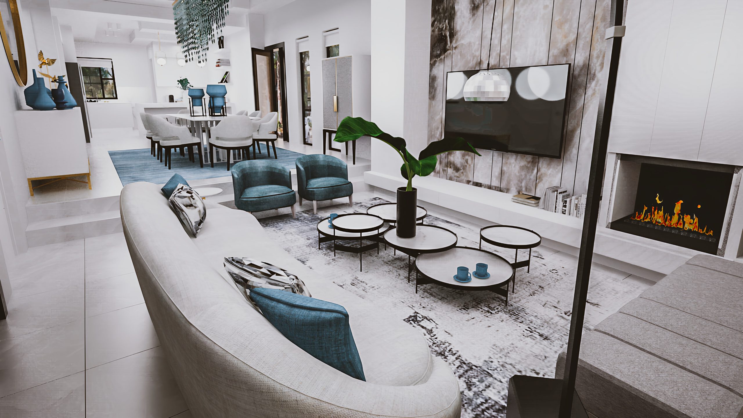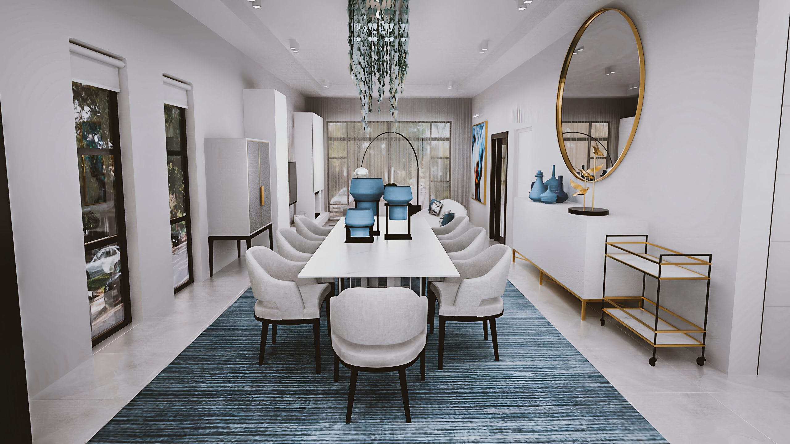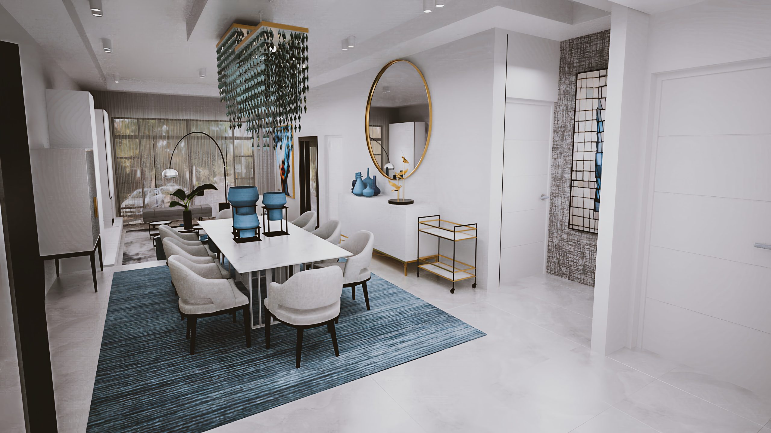 Beautiful rugs with shades of blue create areas for socializing as well tieing in the colour theme. Art in key areas creates conversation pieces. Hints of brushed gold on fittings and on some furniture bring in a warmth to the space.
