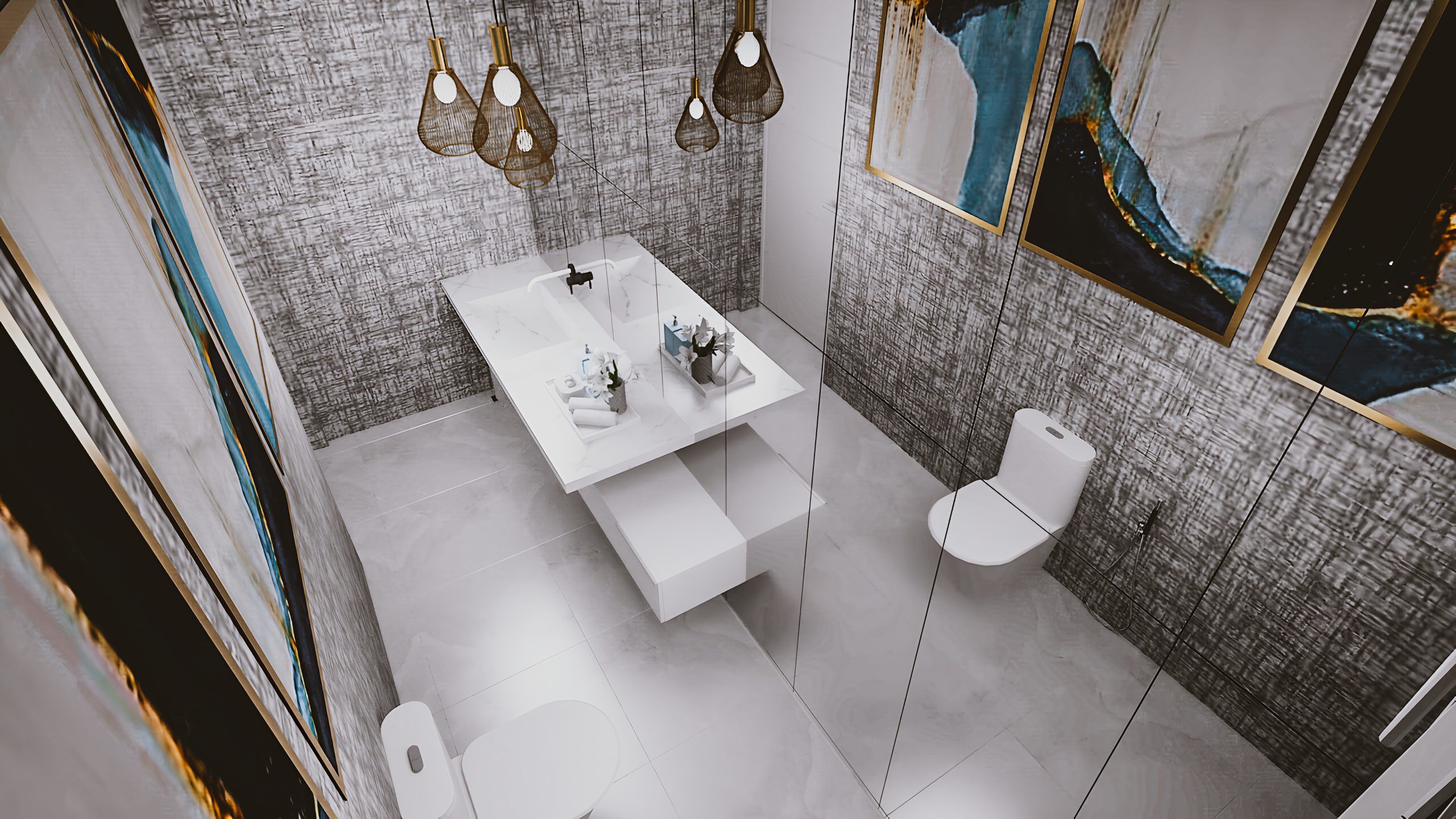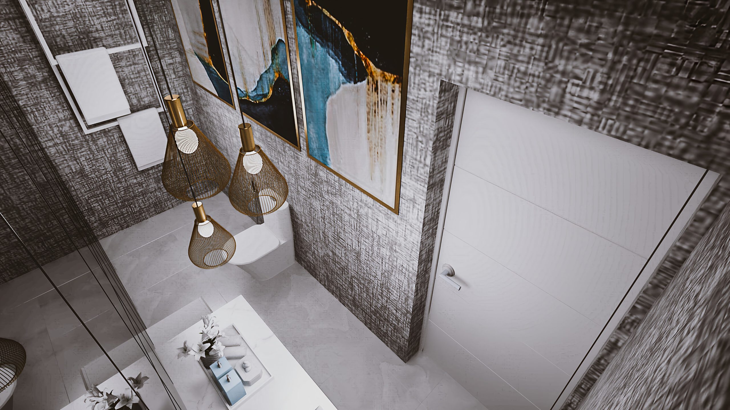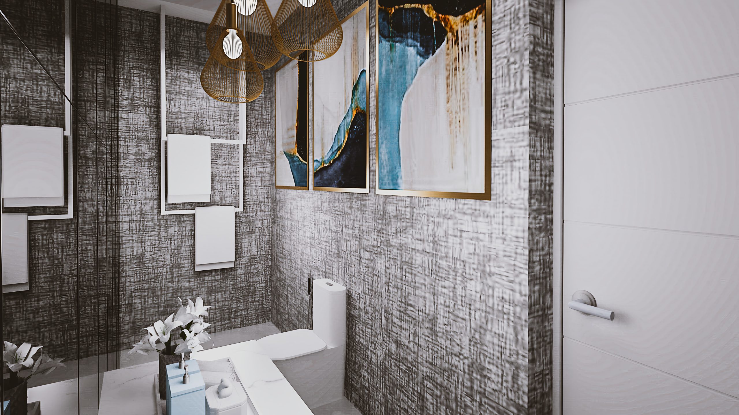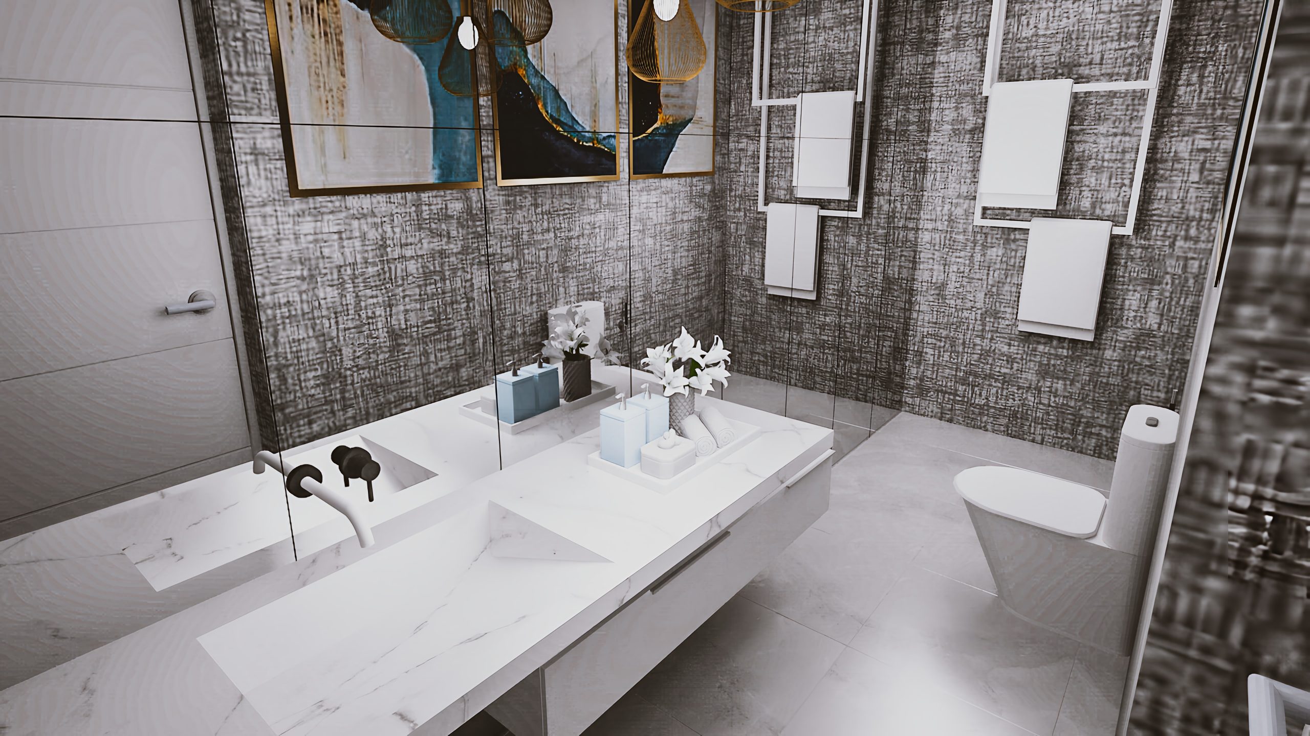 One of our personal favorite pieces is the TV unit with a custom gas fireplace as well as marble feature behind the TV. The guest bathroom also has a full mirror wall with a sculptural vanity and elegant pendant lights to make an impressive statement.