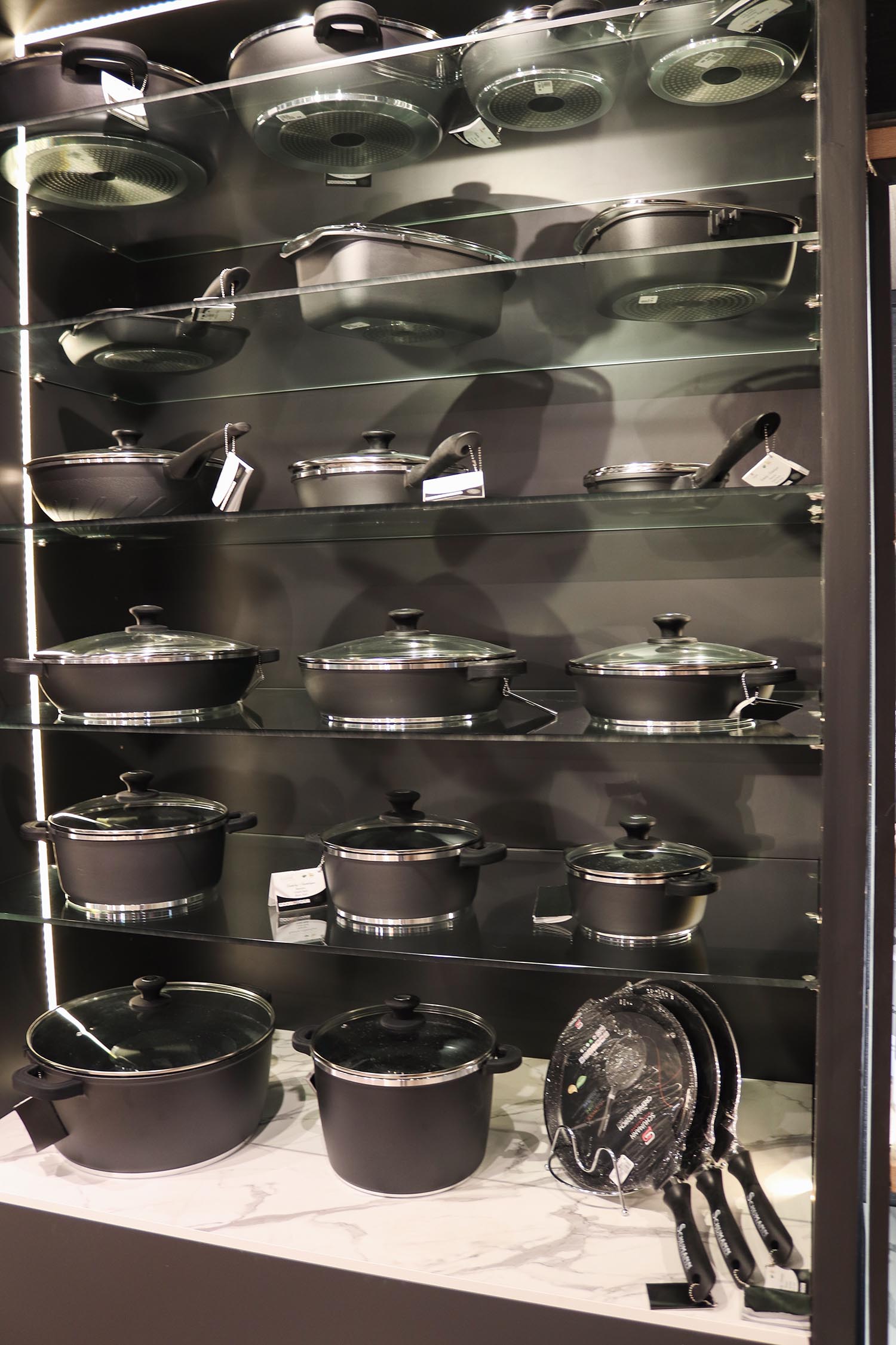 Digital displays show cooking shows while customers browse the shelves of beautiful appliances and kitchen accessories.